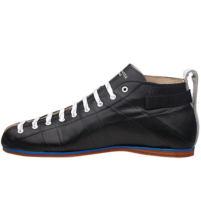 The Blue Streak boots are high end, snug fitting and comfy. Developped by experienced skaters, all details have been well thought through. They are hand made out of Kango-Tan leather, which is remarkably soft and needs little to no break-in time. The counters are reinforced and the inner is full-grain leather, providing comfort and durability. The boot has a open toe box cut leaving the toes untroubled, and it helps avoid tongue movement.